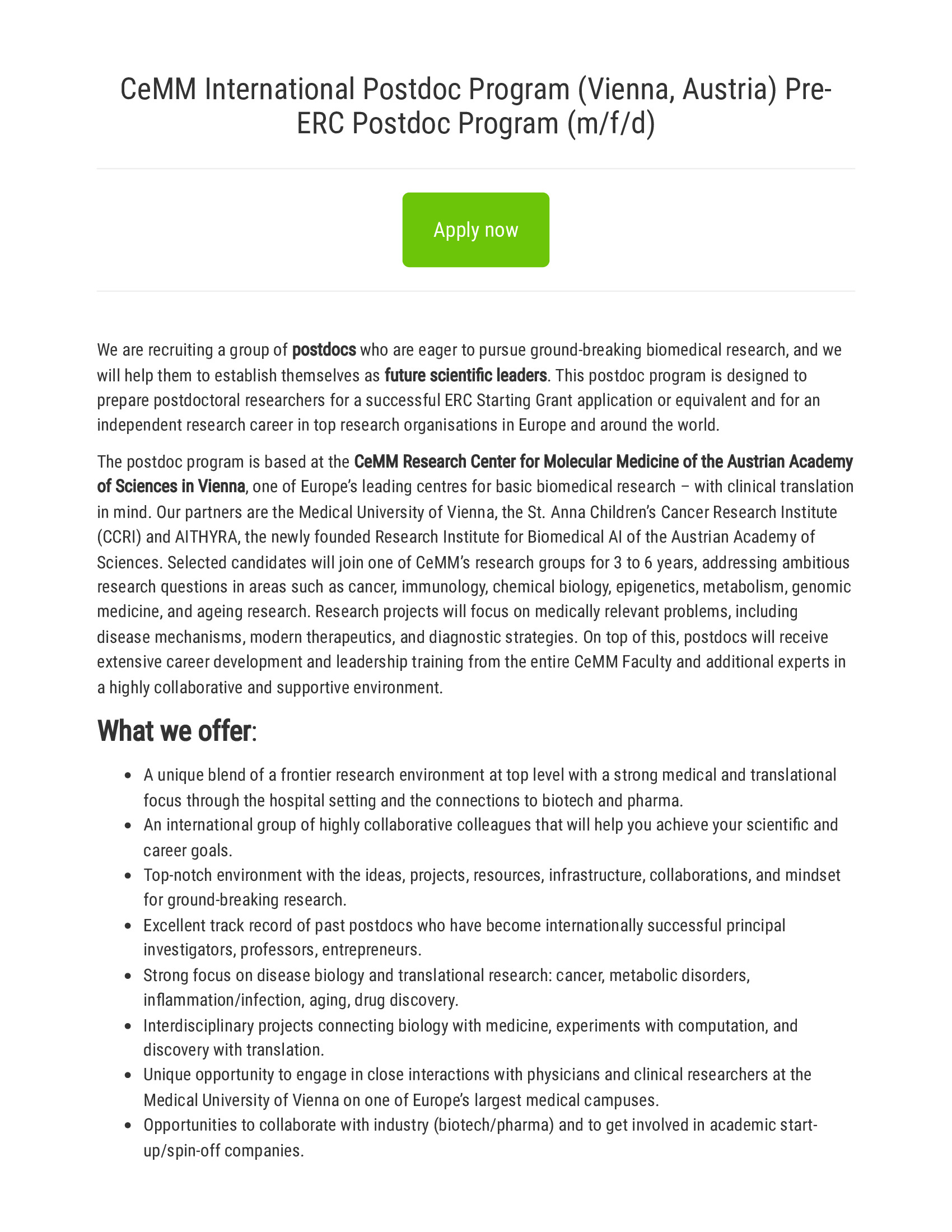CeMM International Postdoc Program (Vienna, Austria) Pre-ERC Postdoc Program (m/f/d)